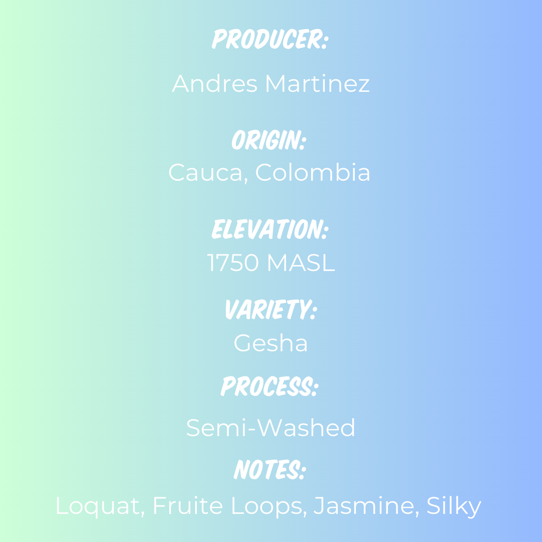 Let's go! This is our third release from the impressive Andres Martinez who has produced some of Enjoy's absolute favorite coffees as of late. His Caturra Floral and Young Producer Inza lots flew off our shelves with their absolutely stunning floral character and complexity for days. Andres is quickly creating a rep for his cup profiles that make you go 'yep, this has to be Andres Martinez' along the likes of some of the industry greats that have a distinct touch and through-line of flavor across their lots. Here we have his Gesha lot which is undeniably one of the loudest floral coffees I've ever tasted in the past 16 years in the industry. If you're a fan of gesha, floral flavors, or just unique and dynamic food and drink, this is an absolute must.
